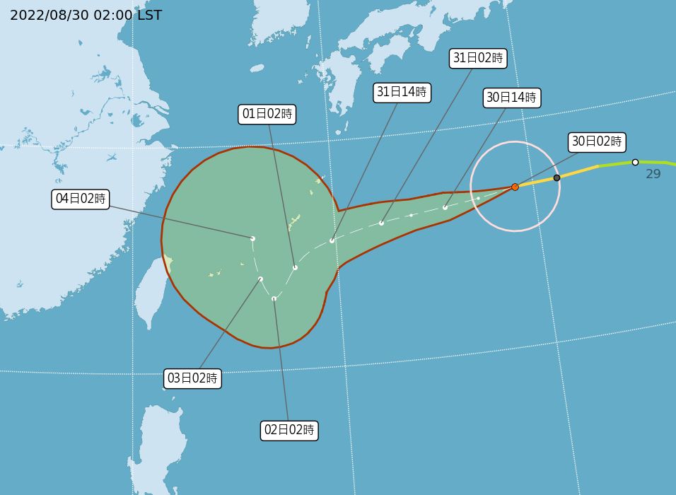 2022年08月30日中央氣象局觀測,中度颱風「軒嵐諾」今天(30日)凌晨2時近中心最大風速每秒48公尺,已來到中颱上限。它的強度比今年過去10個颱風都要強,預估今天將增強為強烈颱風。明晚起(31日)北部轉為有局部短暫陣雨,週四至週六(9月1日至3日)最靠近台灣。