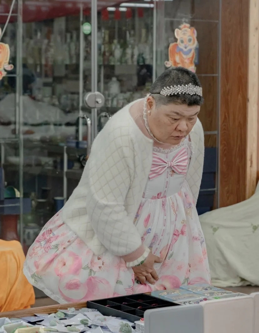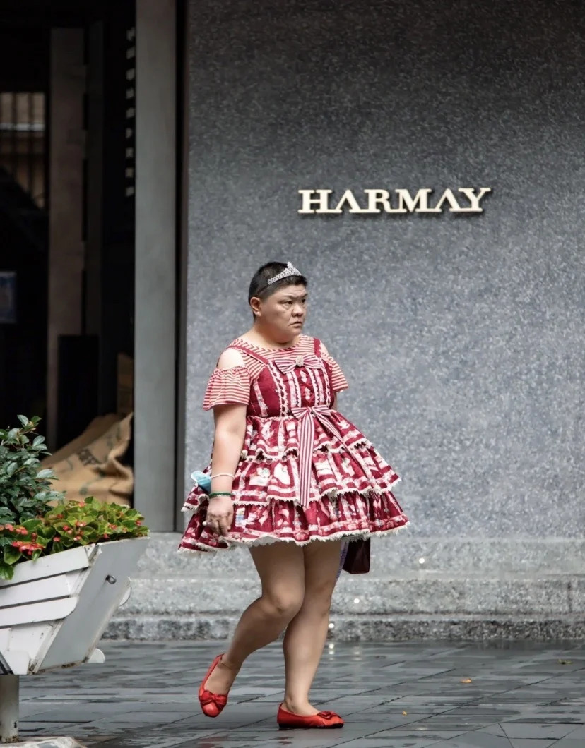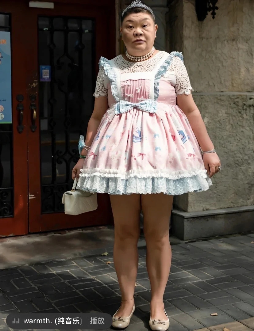 ▼這位生活在上海的中年婦人被網友們稱為「安福路小公主」。她年約50歲,留著平頭、身材微胖,經常在安福路出現。與大多數穿著簡單平凡的中年人不同,「安福路小公主」的裝扮非常精緻,她頭戴皇冠、穿著浮誇的蘿莉塔公主裙,還會搭配項鏈、皮鞋和手提包。