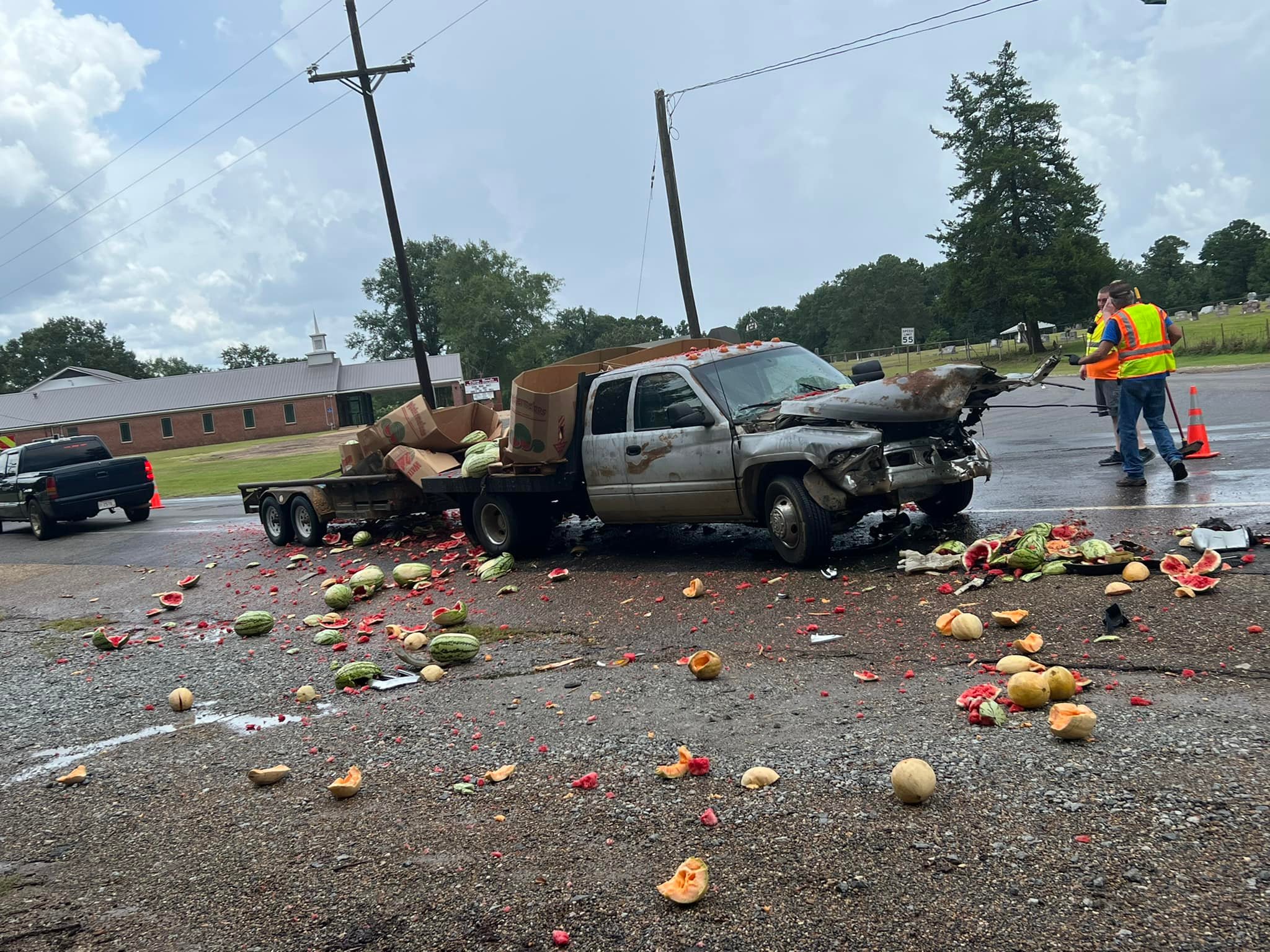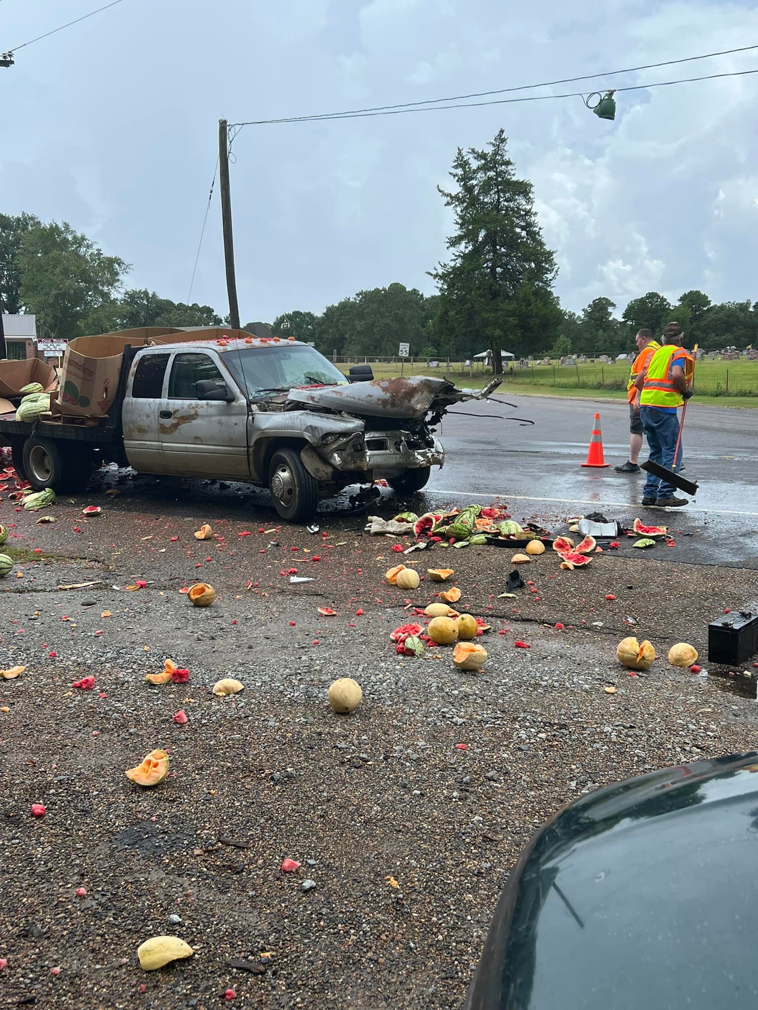 ▼每年7月底,法默維爾都會舉辦節慶活動「西瓜節」(Louisiana Watermelon Festival),活動現場需要大量瓜果。今年活動前夕,一輛載有100多顆西瓜和哈密瓜的農產品小貨車在途中發生意外,車上的瓜果都翻覆到路上摔壞了。