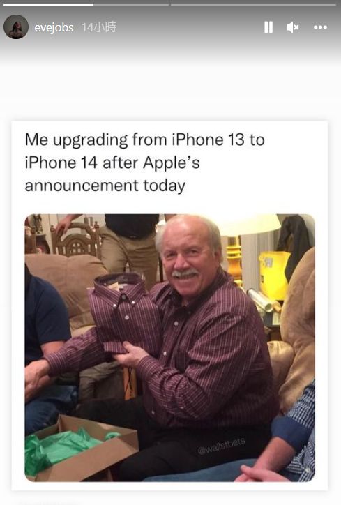 伊芙只是轉貼迷因,沒有親自發文吐槽,但這張梗圖卻讓很多人深有同感,認為iPhone 14沒有新意:「蘋果又發表同一款手機,幾乎沒做什麼更改」、「這是不一樣的,因為會讓你花更多錢」、「兄弟,他們只是一遍又一遍發表同樣的東西」。