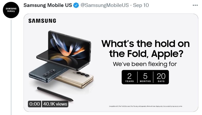 ▼三星於10日在推特上發文和3則影片狂酸蘋果,內文寫道:「來簡單總結一下,我們對於蘋果週三宣布『創新』設備的反應。」影片首先針對摺疊手機:「摺疊手機呢,蘋果?我們推出Flip、Fold系列摺疊機已經2年5個月又20天了。」