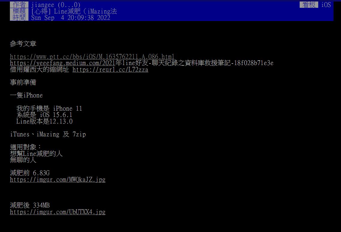 ▼這名網友在PTT發文,分享Line減肥的方法。他使用的是iPhone 11,系統為iOS 15.6.1,LINE的版本則為12.13.0。減肥過程共有6個步驟,事先準備好iTunes、iMazing和7zip,接下來就開始行動。