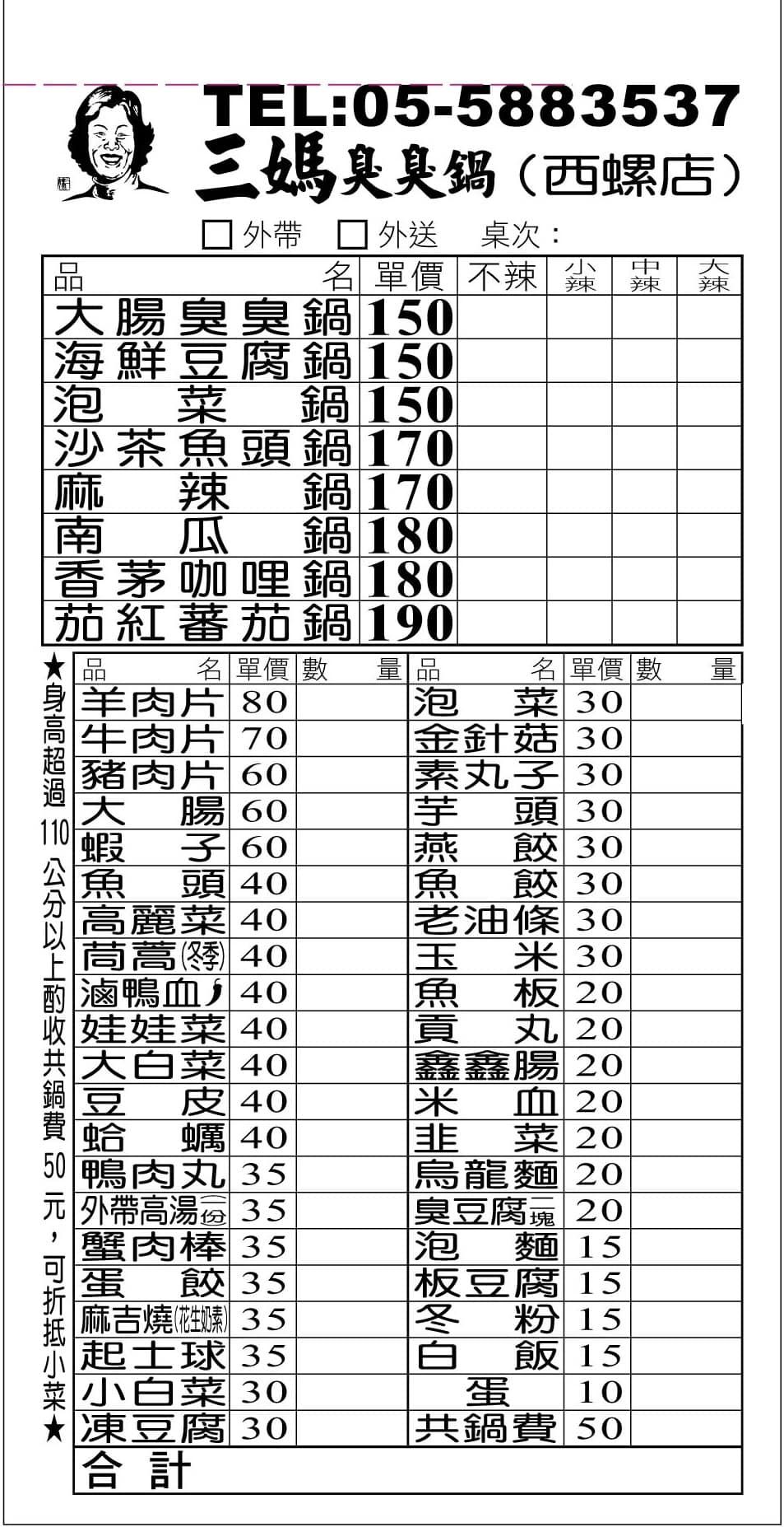 ▼從店家菜單可以看到,三媽臭臭鍋最基本的大腸臭臭鍋、海鮮豆腐鍋、泡菜鍋、素食鍋,幾個跳漲後都來到150元,沙茶魚頭鍋及麻辣鍋調漲為170元、南瓜鍋及香茅咖哩鍋調漲到180元,最貴的則是190元的番茄鍋,另外部分小菜也有調漲。