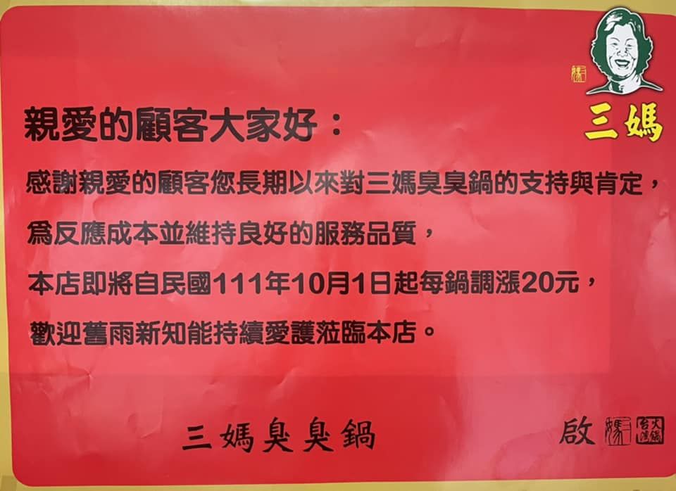 不少店家po出調漲通告時感嘆敵不過通膨,現在三媽臭臭鍋便宜又大碗的象徵不再,雇主又因為物價跟提高薪水而苦不堪言,希望消費者可以體諒漲價一事。
