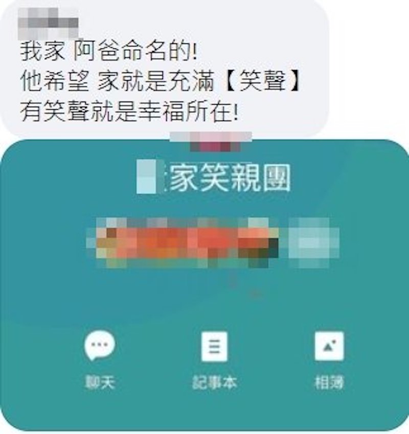 ▼其他網友分享自家群組的名稱,有網友表示自己爸爸取的家群名稱叫「X家笑親團」,因為爸爸希望家中充滿笑聲,有笑聲就是幸福所在。也有網友的家群叫「福胖豬外送服務」,因為「要買什麼在群組說就會有人買,老婆是福胖豬外送服務」。