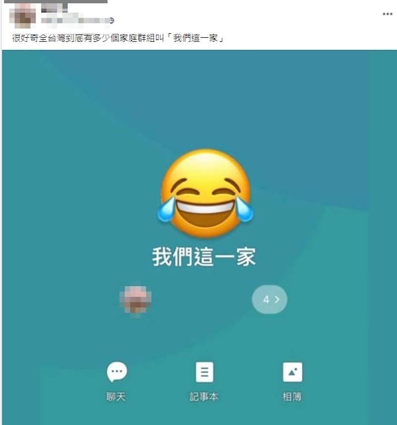 ▼這名男網友在臉書社團「爆廢公社二館」貼出自家群組的截圖,並詢問大家,有多少人和他家群組的名稱一樣,叫「我們這一家」?這則貼文迅速引發熱議,短短幾天時間就有近6千人按讚、2000多則留言。網友們紛紛表示:「我們這一家+1」、「我們家真的叫我們這一家」、「這應該全台都是了」、「一模模一樣樣」、「我家也有一樣名字」。除了「我們這一家」外,還有很多家群名稱是「We are family」。
