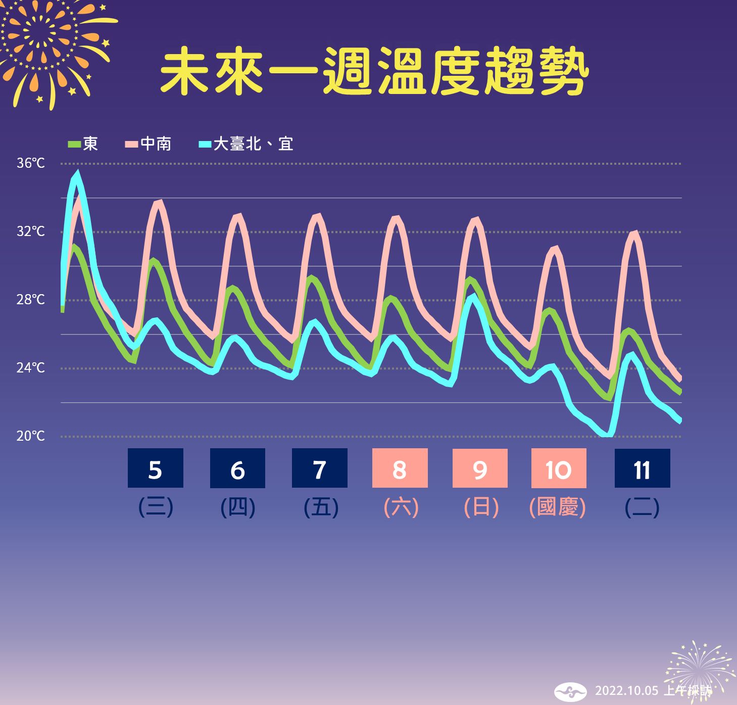 下週一東北季風更強,以乾空氣為主,水氣減少,各地雨勢趨緩,桃園以北、東半部有局部短暫陣雨,溫度更低,北部、東北部下週二(11日)清晨低溫下降至20度,中南部21到23度,白天高溫北部25度、中南部32到33度。