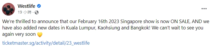 ▼高雄市長陳其邁也開心報喜:「超期待!也歡迎更多世界級的團體與演出,來到多元、精彩的高雄。」並激動在臉書粉絲專頁說:「Westlife 要來高雄了!你的青春裡,是不是也有一首西城男孩?」他進一步說明相關資訊:「Westlife 透過臉書宣布,明年2/26將來台演出。目前公布台灣唯一一場,就在高雄巨蛋!」