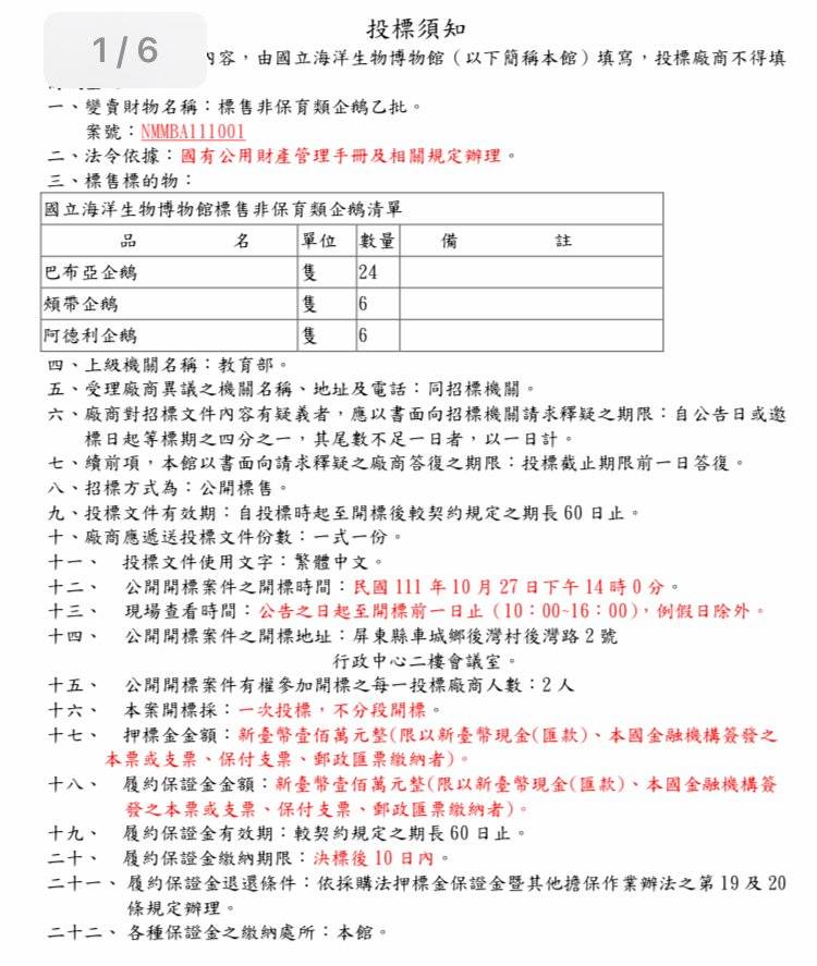 ▼國立海洋生物博物館釋出的投標資訊,標售標的物為24隻巴布亞企鵝、6隻頰帶企鵝、6隻阿德利企鵝,將於10月27日下午2時整公開開標。採一次投標,不分段開標,押標金額為新台幣100萬元、履約保證金金額新台幣100萬元。