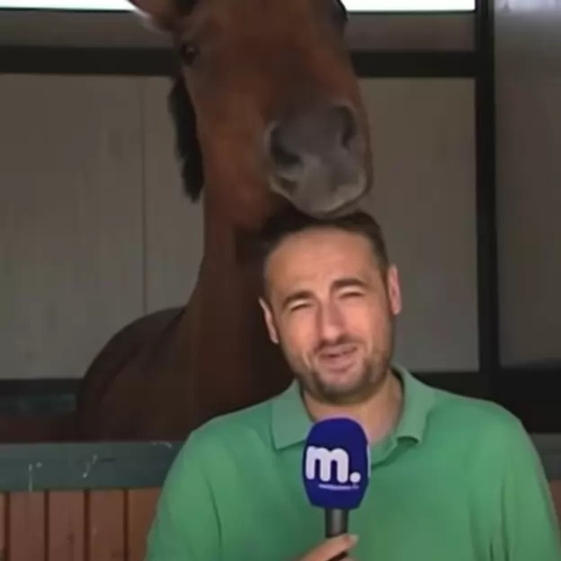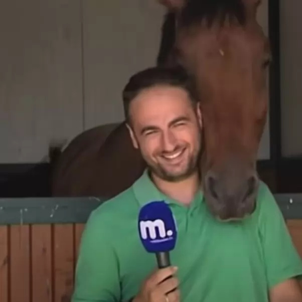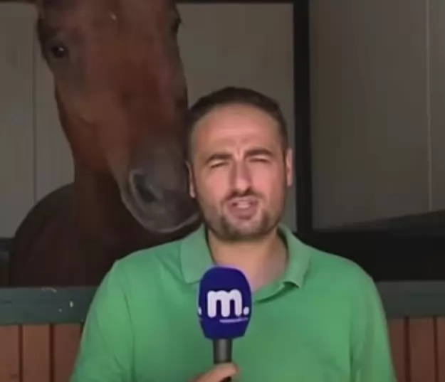 2022年10月24日動物會搶鏡!日前希臘一位記者去馬棚錄影時,遇到了一隻非常俏皮的馬兒。記者工作的過程中,這隻叫Frankie的馬兒不時朝他的脖子吹氣、咬耳朵,還用下巴夾住他的肩膀撒嬌。記者被逗得頻頻發笑,NG不斷。這有趣的畫面被po到網路上後,很快就引發關注。
