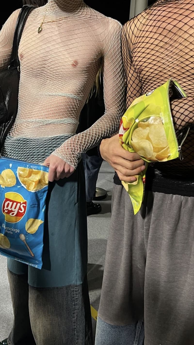 ▼Demna讓模特兒們拿著薯片包走秀。這是巴黎世家與樂事合作推出的包款,共有5種顏色,對應5種不同的口味。外包裝非常擬真,內部則是銀色金屬質感皮革,拿在手上能夠呈現出自然的抓皺效果。