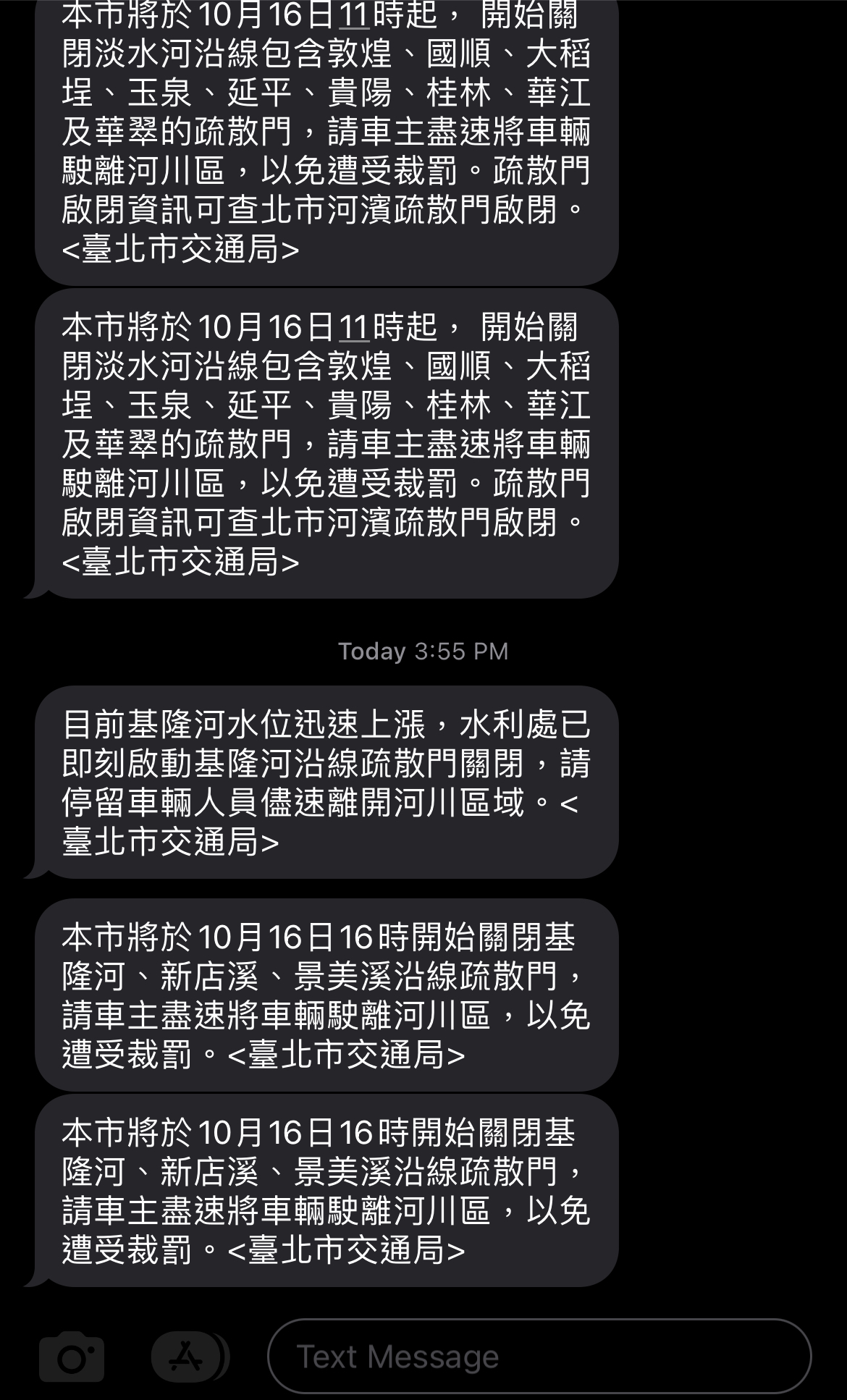 下午4時左右的簡訊則為:「目前基隆河水位迅速上漲,水利處已即刻啟動基隆河沿線疏散門關閉,請停留車輛人員儘速離開河川區域。〈台北市交通局〉。」「本市將於10月16日16時開始關閉基隆河、新店溪、景美溪沿線疏散門,請車主盡速將車輛駛離河川區,以免遭受裁罰。〈台北市交通局〉。」