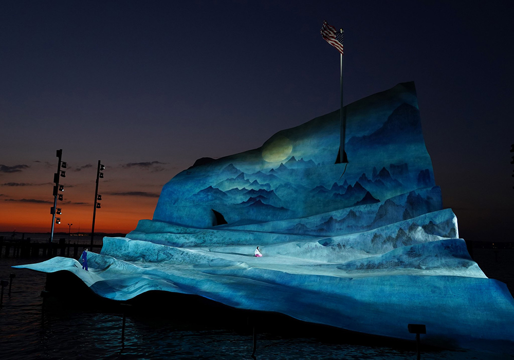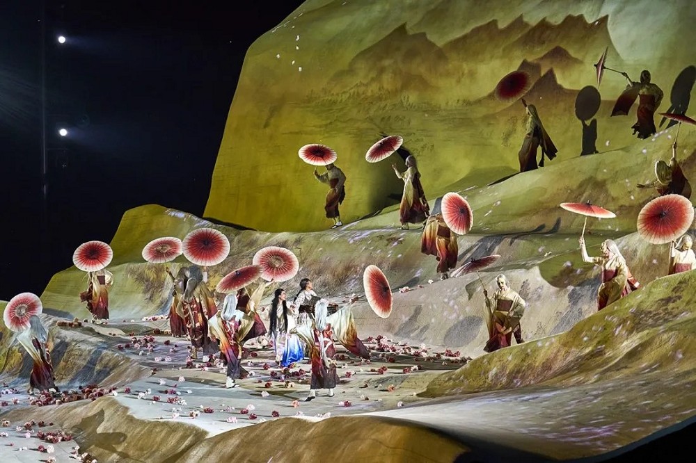 ▼《蝴蝶夫人》的創作背景是19世紀末的日本,整齣歌劇充滿日式風情。舞台設計師Michael Levine以「將一幅美麗的日本古卷軸畫扔在湖上」為發想,打造出唯美壯觀的摺紙舞台。