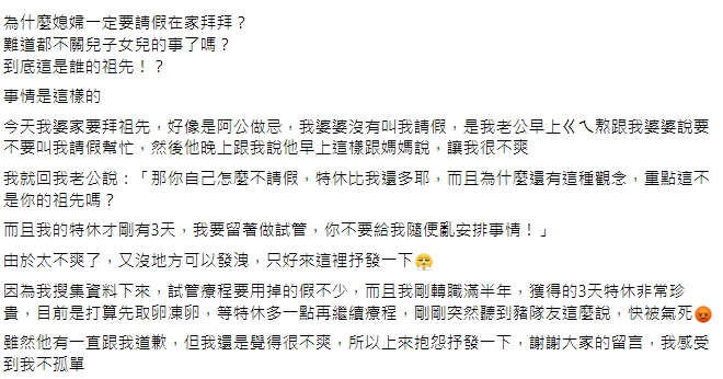▼原po聽到老公的話回嗆:「那你自己怎麼不請假,特休比我還多耶,而且為什麼還有這種觀念,重點這不是你的祖先嗎?而且我的特休才剛有3天,我要留著做試管,你不要給我隨便亂安排事情!」原po表示,她剛剛轉職滿半年,獲得的3天特休非常珍貴,本來是打算先取卵凍卵,等特休多一點再繼續療程,沒想到老公竟要求她請特休幫忙祭祖。