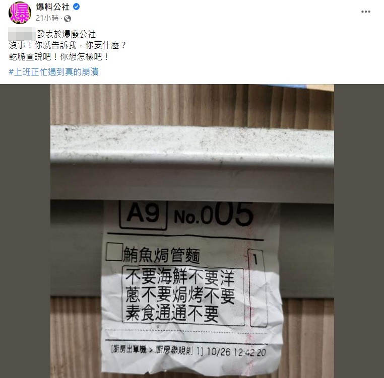▼這位老闆表示,一位住戶點了「鮪魚焗管麵」要外送,但備註中卻說「不要海鮮、不要洋蔥、不要焗烤、不要素食、通通不要」。老闆看到這奇葩的要求,不禁崩潰直呼:「沒事!你就告訴我,你要什麼?乾脆直說吧!你想怎樣吧」、「上班正忙遇到真的崩潰」。