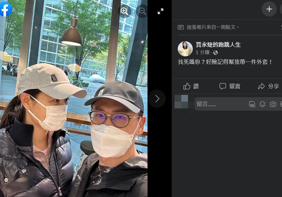 ▼當時賈永婕一個人身上沒有一毛錢、天氣又冷,被罰坐在門口,「重點是沒有手機,我好無聊,最後站起來拉筋」。最後老公帶錢趕回來,她曬出合照配文,忍不住吐槽說:「找死嗎你?好險記得幫我帶一件外套!」