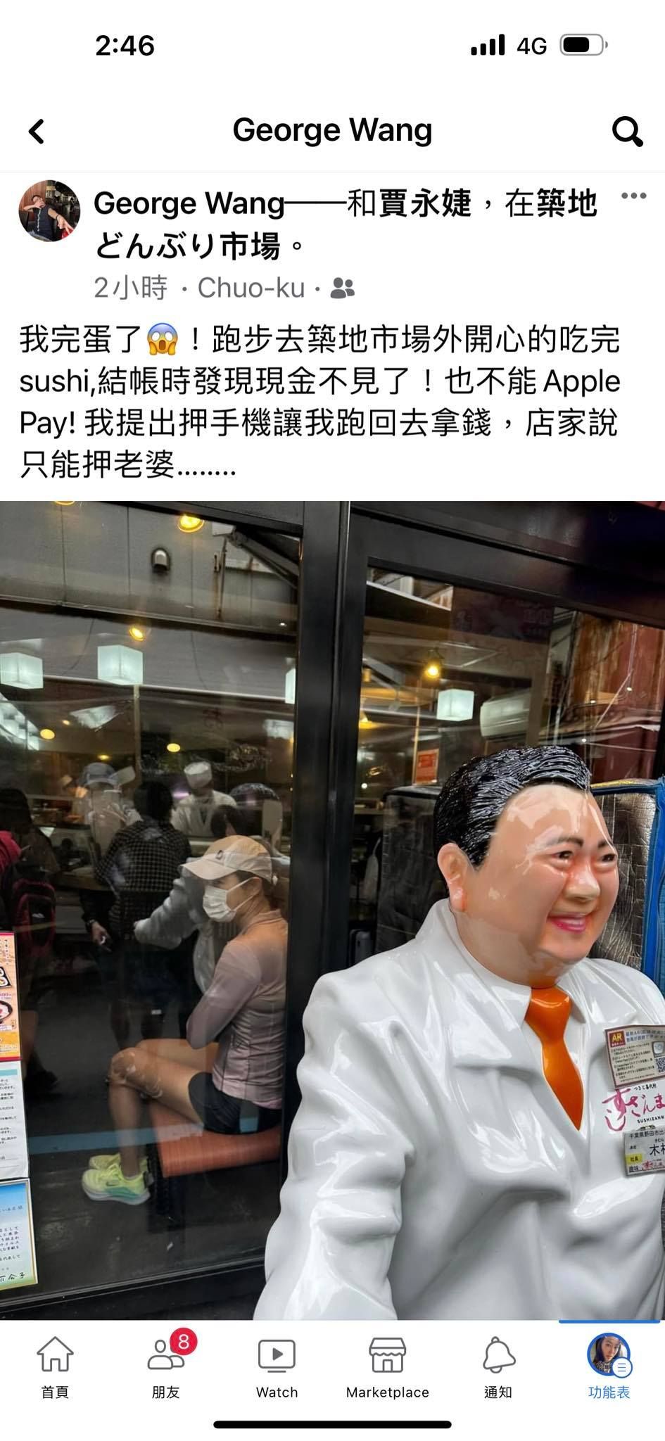 ▼賈永婕表示,她和老公早上起床後,原本很開心外出跑步,沿著皇居慢跑時,老公提議跑步去築地吃早餐。兩人在築地市場吃完壽司後,驚覺現金不見了,而且也不能Apple Pay,場面一度非常尷尬。
