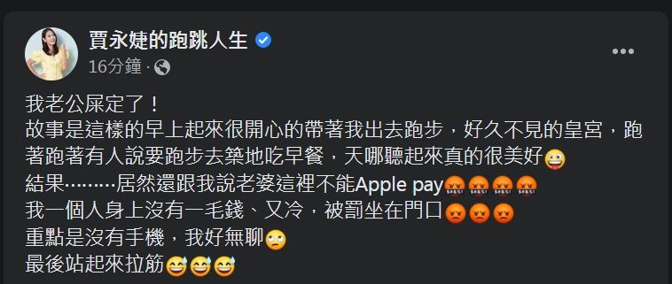 2022年11月09日近日「防疫女神」賈永婕和老公到日本東京旅行,沒想到竟發生被罰坐在門口的意外。原來她和老公出門跑步,吃早餐結帳時發現沒帶現金。老公原本打算押手機回去拿現金,店家卻要賈永婕留下「抵押」,讓她只好待在原地,忍不住發文:「我老公屎定了!」