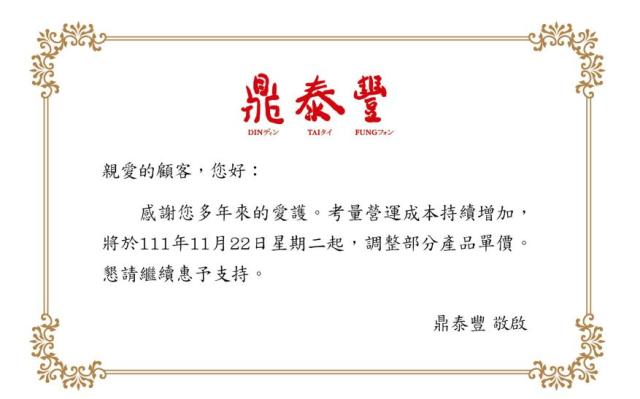 ▼對於這次漲價,鼎泰豐指出,考量整體營運成本持續增加,除了原物料成本之外,疫情也造成服務業人力缺口。為持續提供優質的服務與餐點品質,公司在招募人才、薪資福利、教育訓練等方面有更多成本投入。調整價格實在是不得不的做法,感謝顧客體諒與支持。
