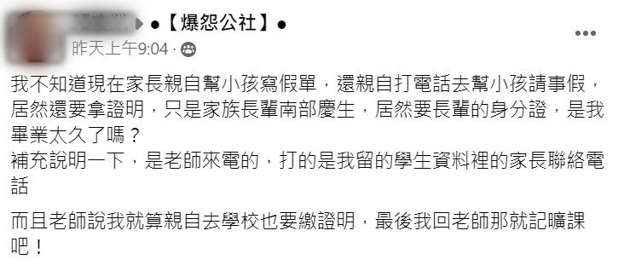 這名家長在臉書社團「爆怨公社」po文說:「我不知道現在家長親自幫小孩寫假單,還親自打電話去幫小孩請事假,居然還要拿證明。」他要帶兒子回南部幫家族長輩過生日,結果老師來電要求繳交長輩的身分證證明。老師表示,就算是家長親自去學校請假,也要繳證明。
