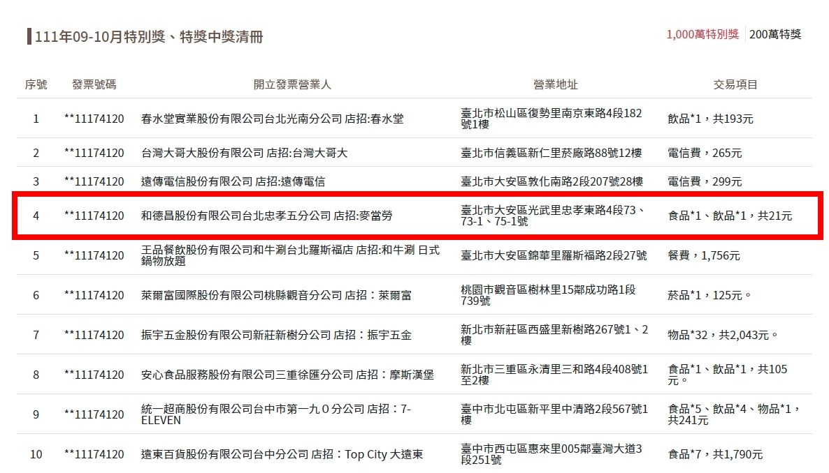 2022年12月06日日前財政部公布9-10月期統一發票中獎清冊,有一位中獎者在麥當勞花21元就抱走千萬元大獎。一些網友看到後非常好奇,從清冊上來看,這位中獎者在麥當勞點了食品1、飲品1,怎麼可能21元就買到?對此,麥當勞回應說,中獎者是員工~
