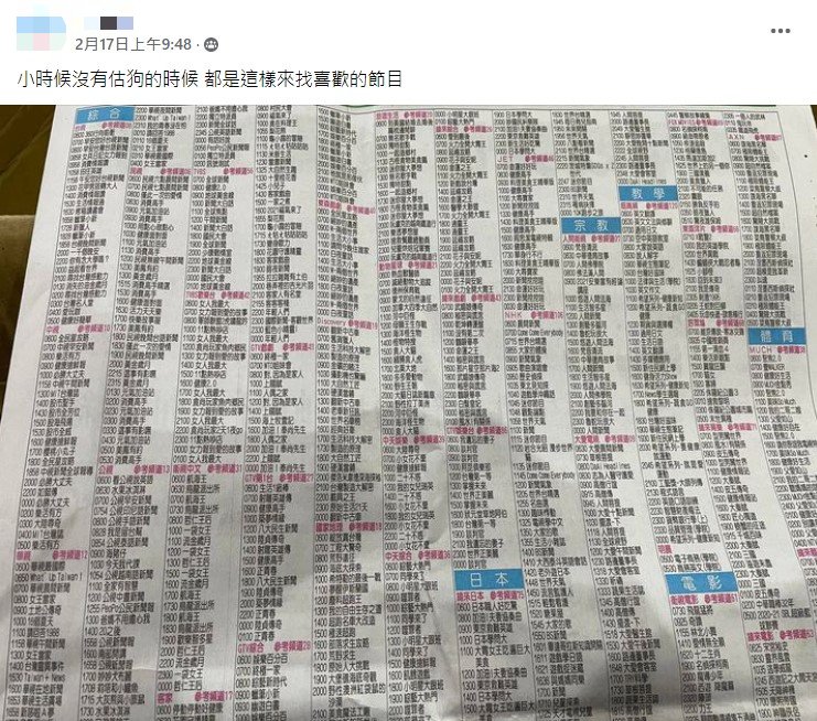 ▼這名網友在臉書社團「爆廢公社」po出一張照片,從畫面中可以看到,報紙上顯示的是各大電視頻道的節目表,頻道分門別類、各時段的播出節目也一目了然。原po表示:「小時候沒有估狗,都是這樣來找喜歡的節目。」