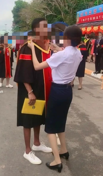 ▼據報道,這對兄妹居住在泰國洛坤府,妹妹就讀於素叻他尼皇家大學公共行政系,2018年畢業。但因為疫情的因素,延遲到現在才拿到畢業證書。畢業當天,妹妹跟其他畢業生一樣,身穿學士服跟家人合照,她決定做一些特別的事情來感謝哥哥。