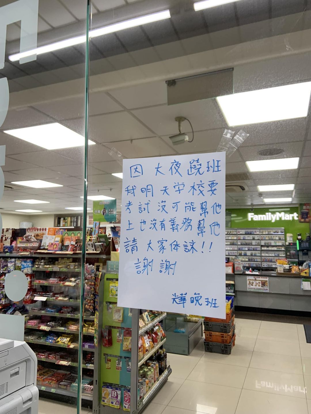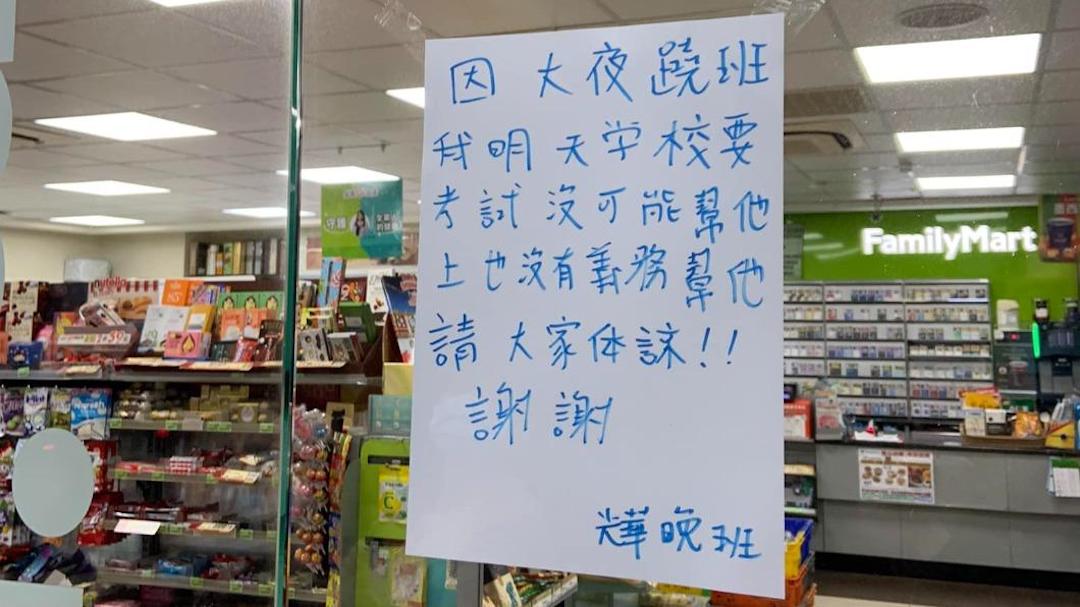 一名網友在臉書社團「路上觀察學院」po出一張照片,只見超商門口貼著一張公告,上面寫著「因大夜翹班,我明天學校要考試,沒可能幫他上,也沒義務幫他,請大家體諒!!謝謝!」
