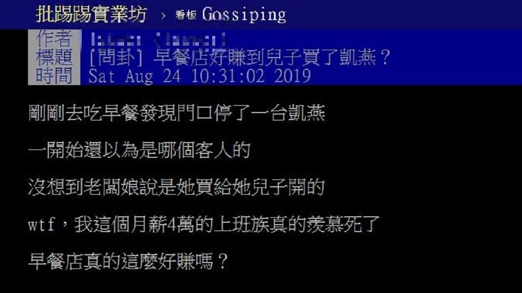 這名網友在PTT八卦版發文詢問:「早餐店好賺到兒子買了凱燕?」他提到去早餐店吃早餐時,看到門口停著一輛凱燕(Porsche Cayenne,保時捷休旅車),原本以為是哪一位客人的座駕,沒想到老闆娘說,那是她買給兒子開的。
