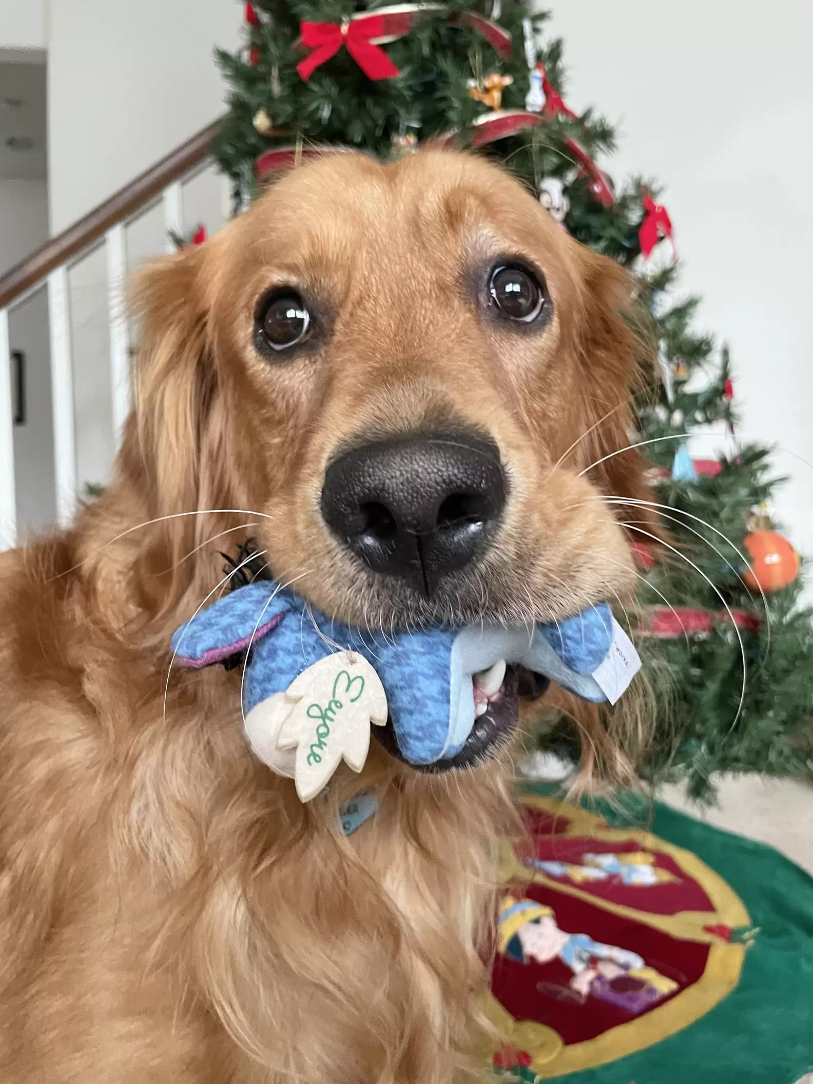 ▼Lauren笑說:「牠偷走那個玩偶後,會叼在嘴巴裡,或抱著一起入睡。聖誕樹上有很多毛絨玩偶,但Ryder只偷過屹耳。」