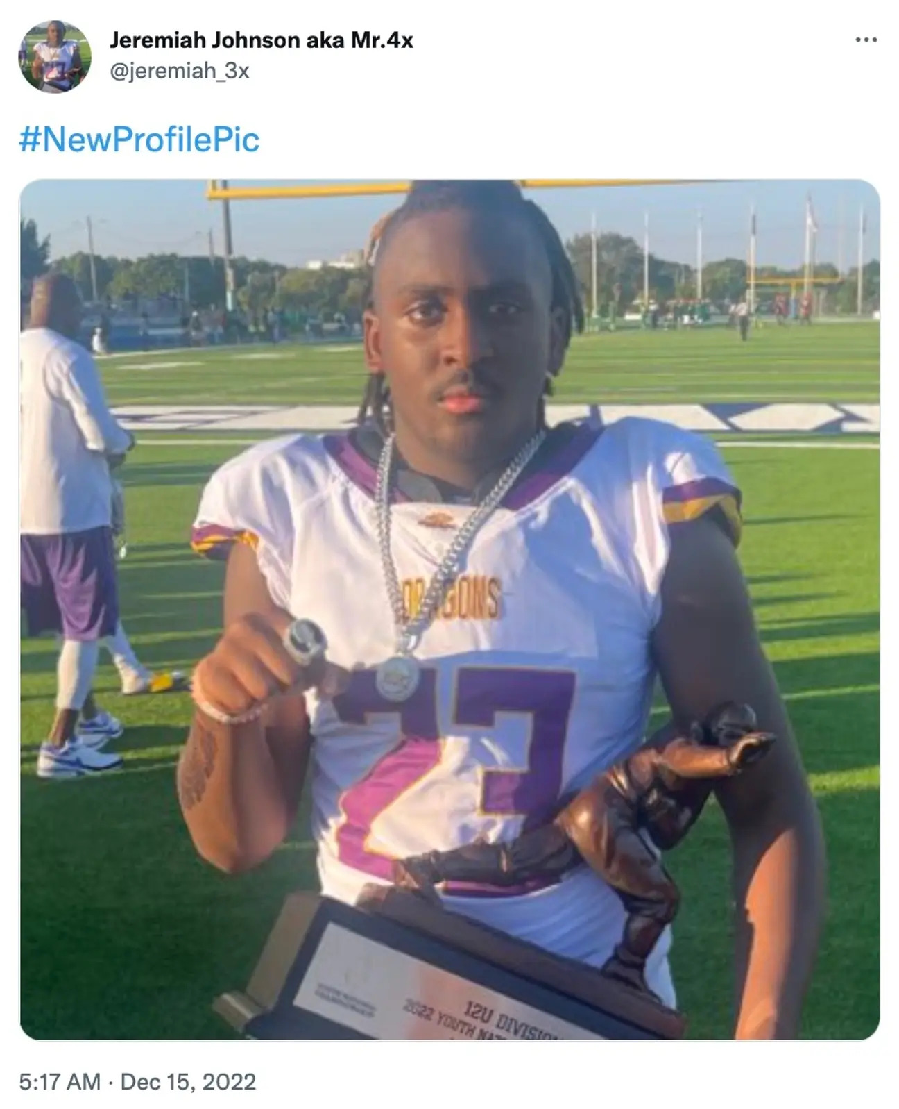 2023年09月03日在邁阿密舉行的全國青年美式足球錦標賽上,12歲男孩Jeremiah Johnson上演狂奔45米得分的精彩戲碼,並協助球隊奪冠。Jeremiah在這場賽事拿下「最有價值球員」獎,但他拿著獎盃的照片在網路上傳開後,卻引發討論。網友們紛紛表示,不相信他只有12歲,說是22歲也不為過。