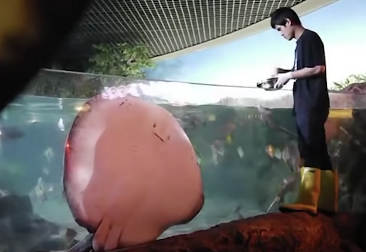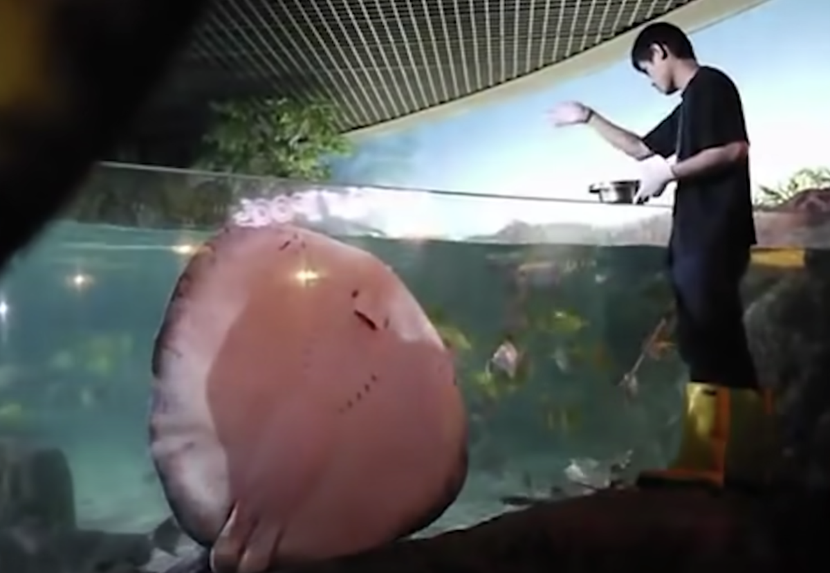 ▼從影片中可以看到,玻璃缸中有大大小小很多魚,飼育員投餵時,其他魚都在興奮地游來游去、積極搶食,只有體型最大的魟魚乖乖貼在水缸旁,似乎是在等待飼育員餵食。魟魚的嘴巴和鼻腔都在身體底部,看起來就像一張人臉,隨著呼吸一張一縮時,看起來更是乖巧可愛。