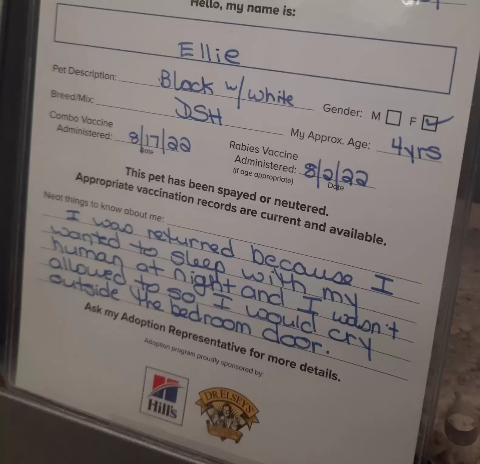 ▼當時Julia去參加收容所的認養活動,注意到籠子裡有一隻黑貓,一直在磨蹭籠子討摸摸,看起來十分親人,但遲遲沒有人認養牠。Julia走近去看貓咪的資料卡,得知Ellie的過去,原來牠曾經有溫暖的家,但因為太親人、想跟主人一起進臥室睡覺,主人不同意,牠就在門口喵喵叫哀嚎,最終導致被退養。