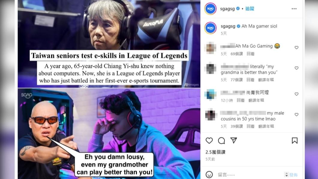 ▼雖然「弘光尚青電競隊」在賽事中敗北,但成員們的心態都很好,他們認為輸贏其次,比賽的過程,還有跟對手廝殺的樂趣才是最重要的享受。這件事引發外媒紛紛報導,新加坡社群帳號sgagsg更是將姜宜淑打電競的畫面做成梗圖配文寫道「你這個魯蛇!一個台灣阿嬤打英雄聯盟都比你強!」,吸引上萬名粉絲按讚留言。