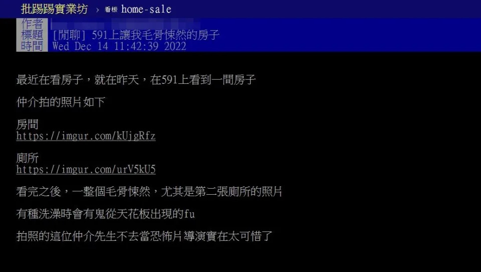 ▼原po表示,這間公寓套房讓人毛骨悚然,「拍照的這位仲介先生不去當恐怖片導演實在太可惜了」。網友們看到後紛紛留言說:「投資客最愛這種,拉個皮馬上變高級」、「買來租片商拍恐怖片都不用佈置了」、「仲介的工作也是不容易,這種房子也要踏進去」。