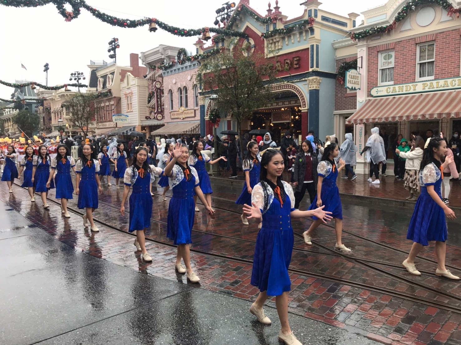 ▼加州迪士尼所在的城市安那罕(Anaheim)4日飄雨,演出前雨勢不小,園方一度考慮取消表演。提早進入園區準備的學生們也非常忐忑,深怕錯過這難得的機會,幸好最後遊行照常出發,學生們也如願完成演出。