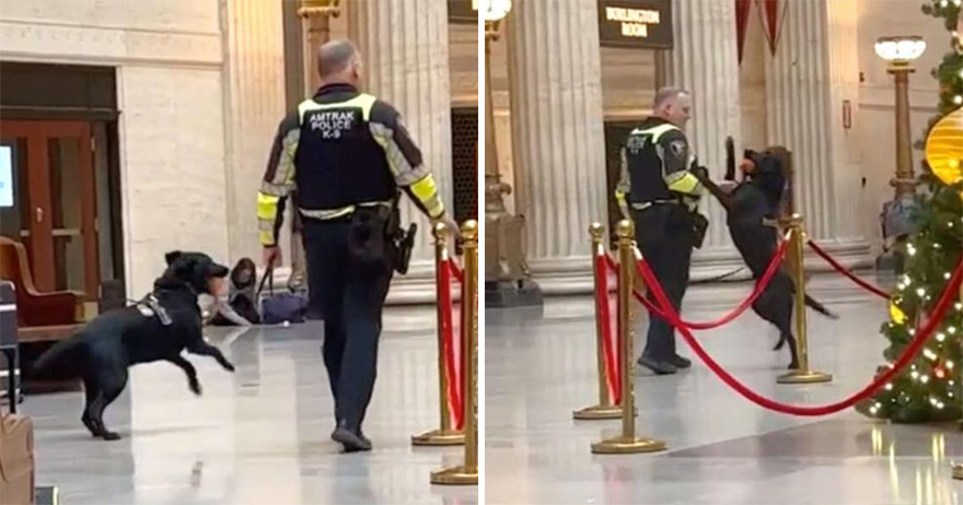2023年01月16日警犬平時威風凜凜,但下班後也跟一般的狗狗一樣,愛玩愛鬧阿撒嬌。日前聖誕節假期前,網友Caitlin Springer在車站等車,準備回家跟家人團聚,突然出現的聲響吸引了她的注意,原來是一隻警犬和領犬員的可愛互動,讓現場的所有人都露出了笑容~