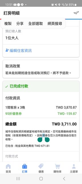 ▼原po忍不住問:「怎日本早餐就在海鮮丼吃到飽?鮭魚、干貝、鮪魚、甜蝦、花枝、鮭魚卵,一大早早餐吃這個吃得下嗎?」這則貼文曝光後引發討論,有人似乎不相信這麼便宜,原po就貼出訂房明細證明,只見上面寫著「1間客房x3晚 TWD 3,870.87」,用了一張95折優惠券,扣掉159.87元後,總金額為台幣3711元。原po補充說:「3711實付3晚含早餐,退房之後現金回饋287信用卡,3711-287=3424,四捨五入一晚算1200。」
