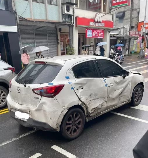 2024年01月11日第一次見到這麼誇張的車子!日前一名女網友在台北街頭看到一台特別的馬自達,只見白色的車身上佈滿傷痕,還貼著許多藍色膠帶,就連後座的車門把手都不見了。這車況令人大傻眼,其他網友也忍不住直呼:「遇到這種車最好可以閃多遠就多遠!」