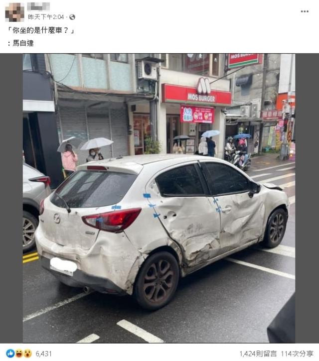 這名女網友在臉書社團「路上觀察學院」po出一張照片,照片中是一台傷痕累累的白色馬自達汽車,車身上有多處凹陷,車門則用違停拖吊的藍色膠帶貼住,車頭的引擎蓋微微彈開,就連後座的車門把手都失蹤了。這誇張的車況令人感到傻眼,這台車到底經歷了什麼?