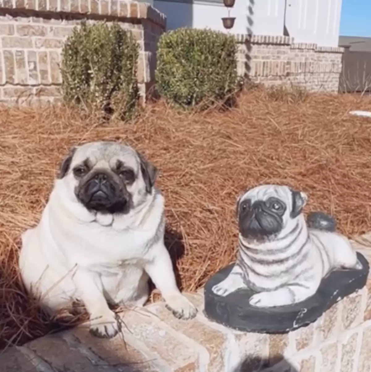 ▼Maggie的馬麻Kamerin Bazemore表示,院子裡有一個跟Maggie長得很像的巴哥犬雕像,Maggie把雕像當成了好朋友,每天都會跑出來陪對方一起看風景、曬太陽。
