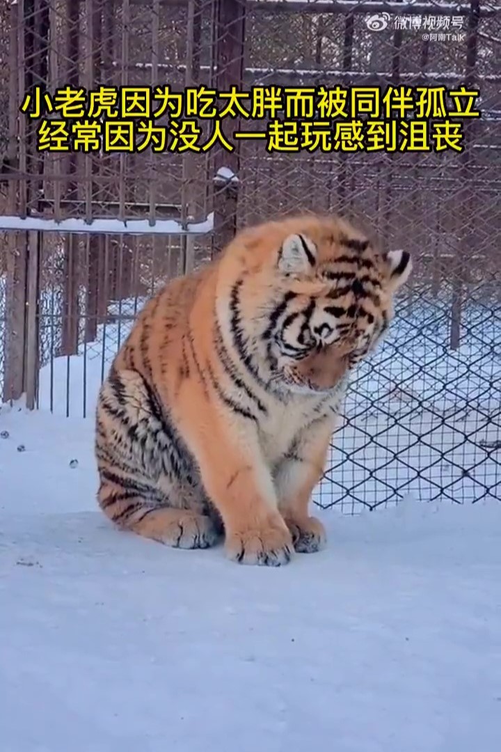 2023年12月29日胖虎出現啦~哈爾濱動物園中有一隻可愛的小老虎,牠因為太貪吃,把自己吃得圓滾滾胖乎乎,看起來超可愛,卻被同伴們「排擠」。其他虎寶寶不願意理牠,有遊客看到牠獨自縮在角落,一臉委屈又可憐巴巴的模樣,好像在說:「太會吃有錯嗎?」