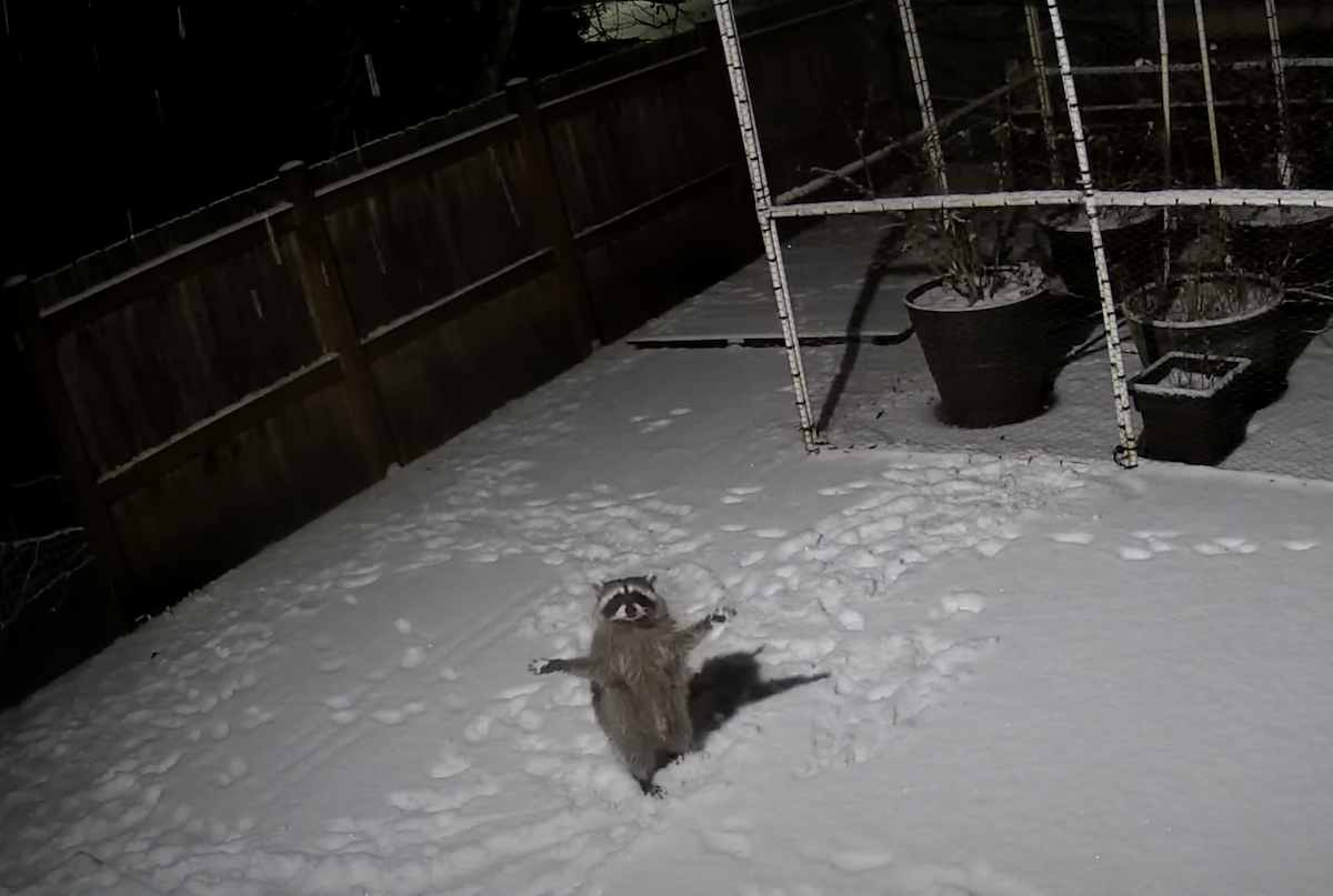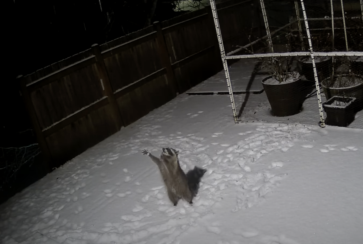 ▼從監視器畫面中可以看到,這隻浣熊對飄落的雪花很感興趣,牠用雙腳站立,並伸出手手想要抓住雪花,那好奇又活潑的模樣就像第一次看到雪的小朋友,可愛又逗趣。Timothy表示,平時就經常有浣熊在自家後院出沒,但這是第一次看到浣熊玩雪~