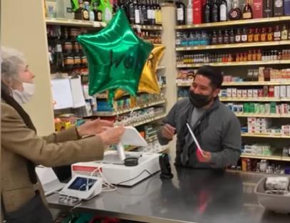 ▼Marion買彩券時跟店員開玩笑說,如果自己中了50萬美元獎金,就分他一半。雖然Marion沒有中得50萬美元,只中了300美元,但她還是遵守承諾,與店員分享。她帶著寫有店員名字的氣球去超商,分給對方150美元,給對方送上驚喜。