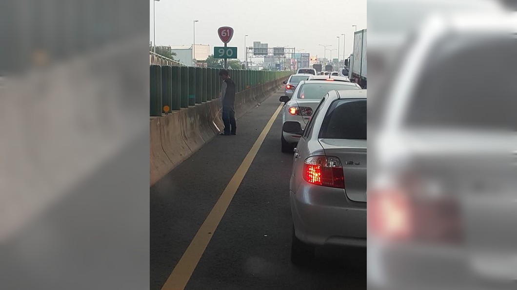 日前有網友在臉書社團「爆廢公社」分享一張照片,照片是在台61線西濱快速公路90公里處拍攝的,現場滿滿車潮,導致塞車無法動彈,看起來就像一個大型停車場。突然間一名男子走下車,他應該是尿急到快憋不住了,實在顧不得其他人的眼光,就直接下車對著內車道的水泥牆「解放」。