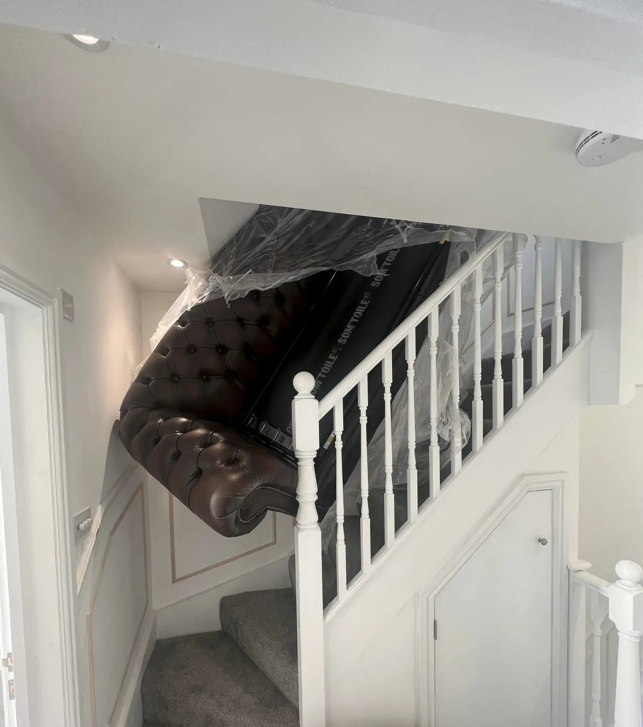 ▼送貨員們將沙發搬運上樓,結果沙發體積太大,卡在樓道中無法移動。Ansell氣憤說:「這時候他們準備離開,還讓我簽收貨物,但我拒絕了。我們為此發生爭執,他們建議我拆掉樓梯扶手,把沙發弄下來。這是我剛買的新房,現在又要花錢維修!」