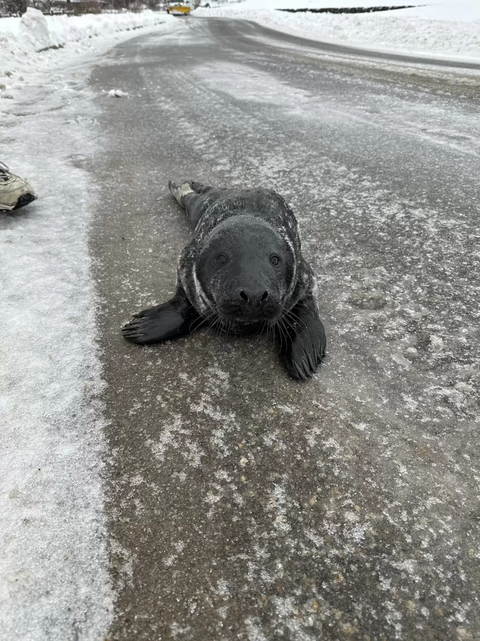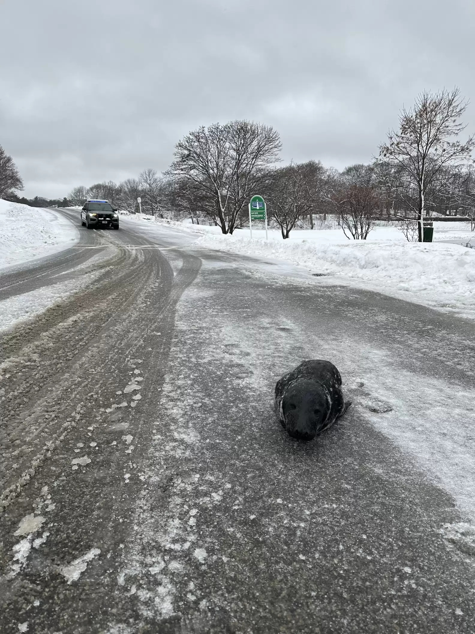 2023年02月15日不久前一天的凌晨1點30分左右,一隻小海豹跑到了美國緬因州的馬路上。當時正在下雪,路邊堆著厚厚的積雪,路面上還有一層薄冰。好心人報警後,員警很快趕到現場,他們發現小海豹沒有受傷,於是將牠送回了海裡。沒想到早上7點左右又有人報警說,小海豹回到了馬路上。