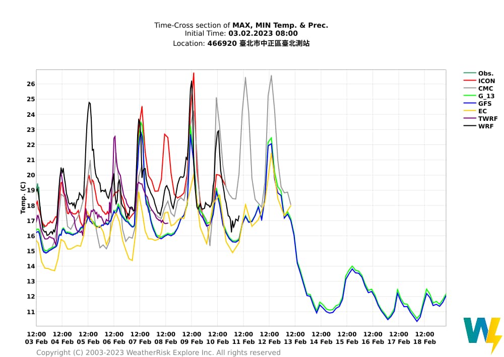 2023年02月06日冬衣先不要收起來!目前台灣受到東北季風影響,各地都有機會出現降雨,但氣溫沒有太大變動,低溫在15度以上。日前氣象專家彭啟明在臉書貼出一張電腦模式模擬台北未來氣溫的預測圖,顯示未來氣溫可能會再下探至10度!