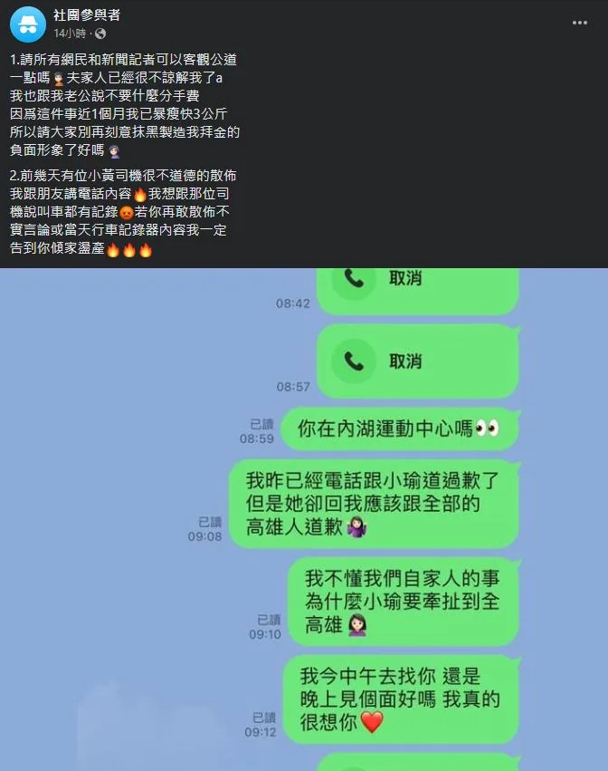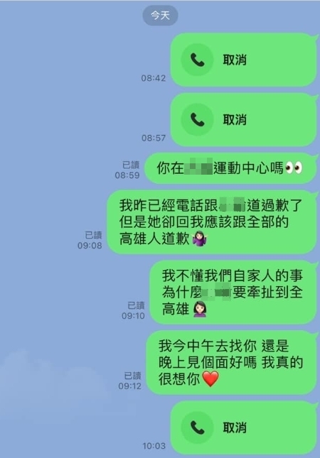 ▼疑似事件當事人的「輔大陳若儀」5日在臉書社團「匿名2公社」發文,曬出一張她跟未婚夫的對話。從對話截圖可以看到,她先打了兩通電話,但男方都沒有接,因此她傳訊抱怨。她疑似已經向小姑道歉,但小姑要求她跟「全高雄人道歉」,這讓她非常委屈,不懂自家人的事「為什麼要牽扯到全高雄?」
