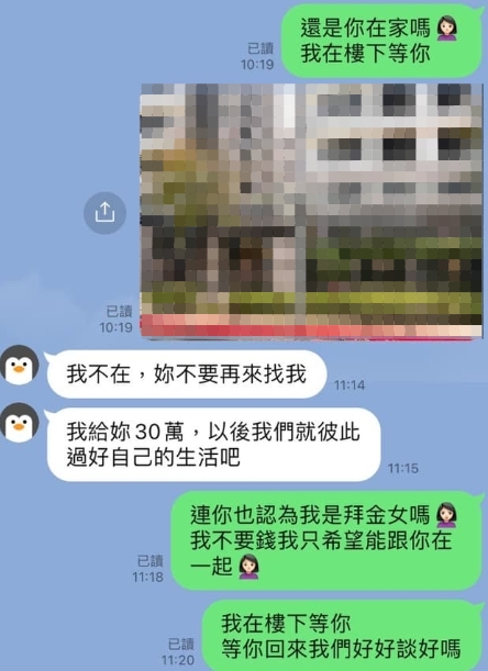 ▼後來她又放低姿態,向未婚夫撒嬌,「晚上見個面好嗎,我真的很想你」。過了1個小時男方還未回電,她直接殺到男方的住處,傳訊表示「你在家嗎?我在樓下等你」。這時男方才回訊息,但不是要跟她見面,而是叫她別再來找自己,還說「我給妳30萬,以後我們就彼此過好自己的生活吧」。